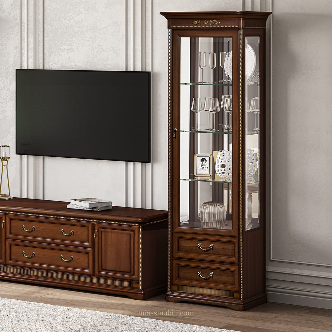 Фасад витрины декорирован накладными элементами. Высококачественная фурнитура обеспечивает долгий срок службы.