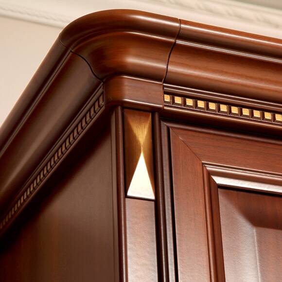 Карниз украшен декоративными накладными элементами с легкой позолотой. Высококачественная фурнитура цвета античной бронзы обеспечивает долгий срок службы изделия.