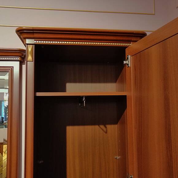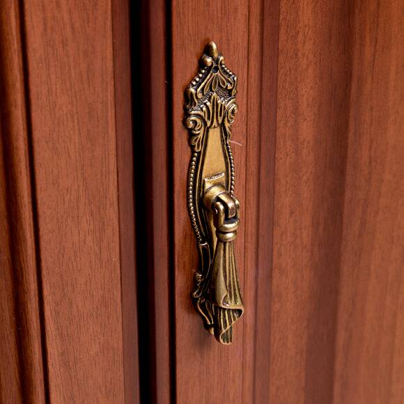Карниз украшен декоративными накладными элементами с легкой позолотой. Высококачественная фурнитура цвета античной бронзы обеспечивает долгий срок службы изделия.