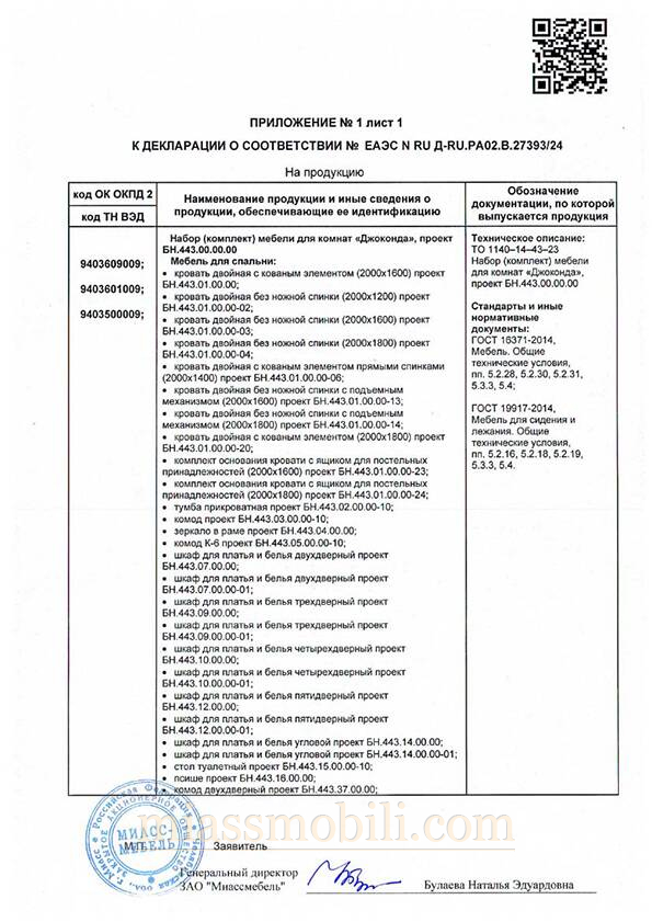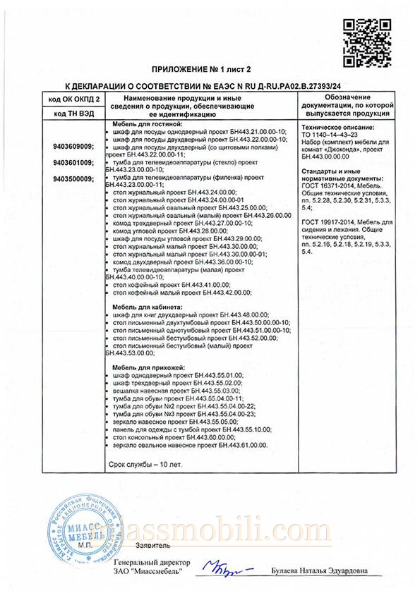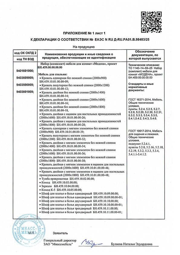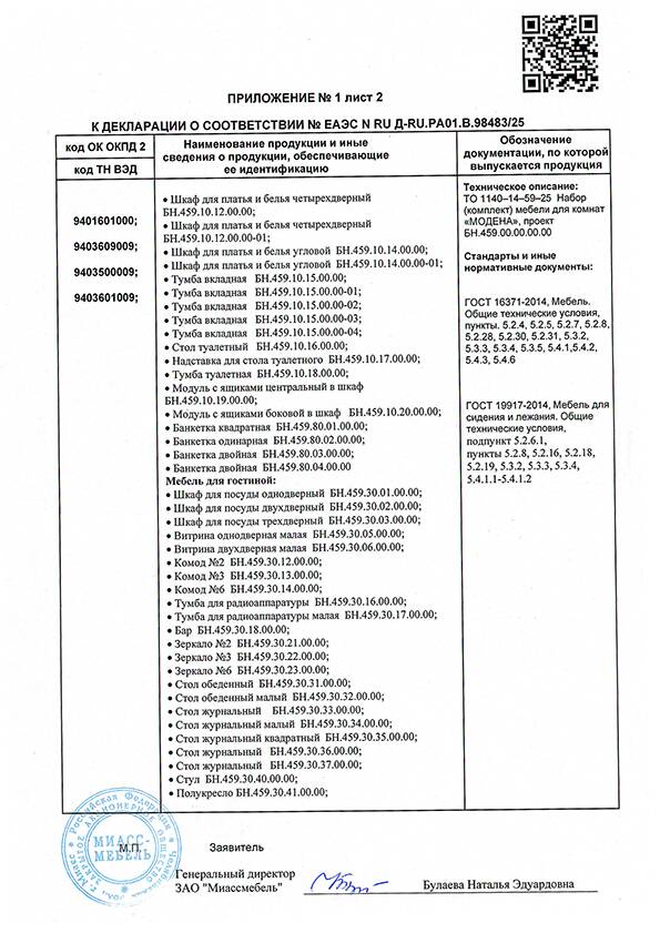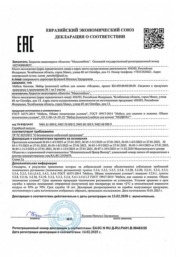 Декларация на мебель Модена